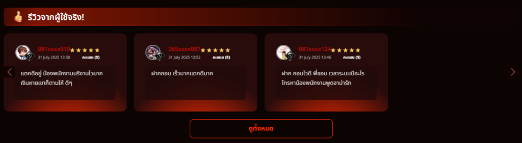 ระบบฝากถอนอัตโนมัติทำงานรวดเร็ว ตลอด 24 ชั่วโมง ช่วยให้ผู้เล่นบริหารเงินทุนได้สะดวก ไม่ต้องรอนาน เพิ่มความคล่องตัวในการเล่นอย่างต่อเนื่อง